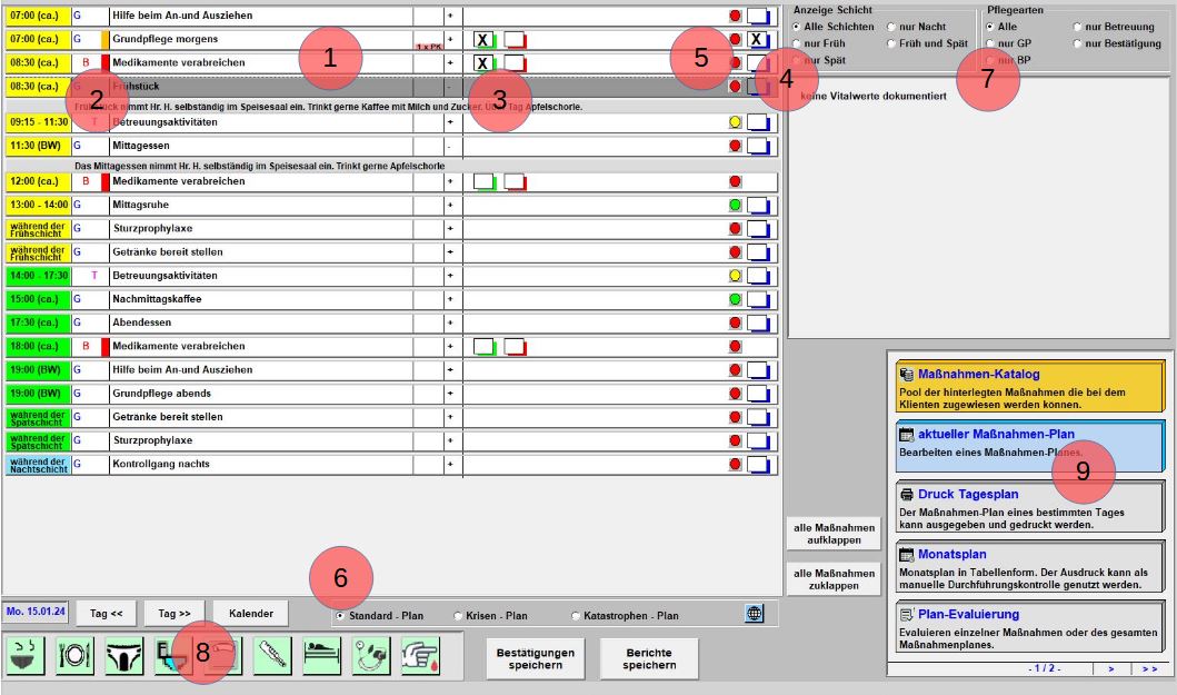Leitfaden: Maßnahmen bestätigen Aufgabe des Moduls Bestätigung der Durchführung von Maßnahmen, die im Maßnahmenplan beschrieben sind. Durchführungsbestätigungen sind erforderlich u.a. für Leistungsnachweis Behandlungspflege. Handhabung Auflistung der Maßnahmen, die für den Tag zu erbringen sind Anzeige der Pflegeart:G – GrundpflegeB – BehandlungspflegeT – BetreuungBalken für Muss-Bestätigungrot – gesetzliche Vorgabeorange – interne Vorgabe Kästchen zum Markieren der erbrachten Leistunggrün anklicken, wenn Maßnahme erbrachtrot anklicken, wenn Maßnahme verweigertblau, wenn zur Maßnahme ein Bericht eingegeben werden soll Maßnahmentyp Datums-Auswahl, für das bestätigt werden soll, im Regelfall der aktuelle Tag. Für Nachträge oder für Info kann ein abweichendes Datum ausgewählt werden.Auswahl der Anzeige nach Maßnahmentyp (Normal-, Krisen- oder Katastrophenfall Anzeige-Filter für die Maßnahmen:schichtbezogen und/oderPflegeart (Grundpflege,Behandlungspflege,Betreuung)nur Maßnahmen, die bestätigt werden müssen Eingabe von Vitalwerten Bearbeitungs-Menues:Maßnahmenkatalogaktueller Maßnahmen-PlanDruck TagesplanDruck MonatsplanPlan-EvaluierungEinsatz-Planung